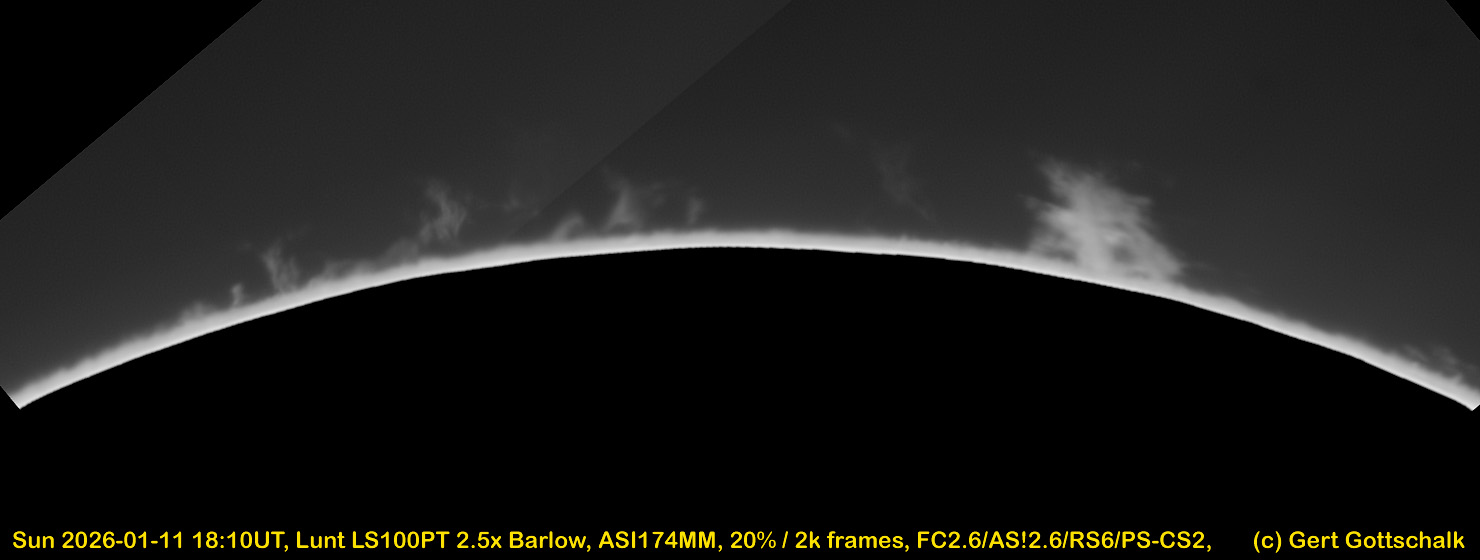 2026-01-11 18:09UT. We are starting the 2026 solar obserbing session. A nice day in January provided a good view of the solar disk in combination with prominences.